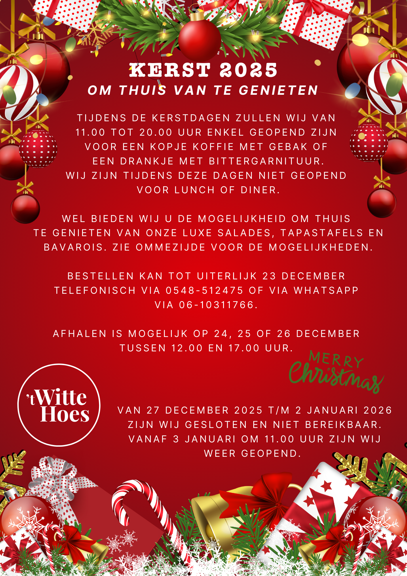 Tijdens de komende kerstdagen zullen wij wederom enkel geopend zijn van 11.00 tot 20.00 uur voor het drinken van een kopje koffie of een drankje met gebak of bittergarnituur. Wij zijn tijdens deze dagen niet geopend voor lunch of diner.