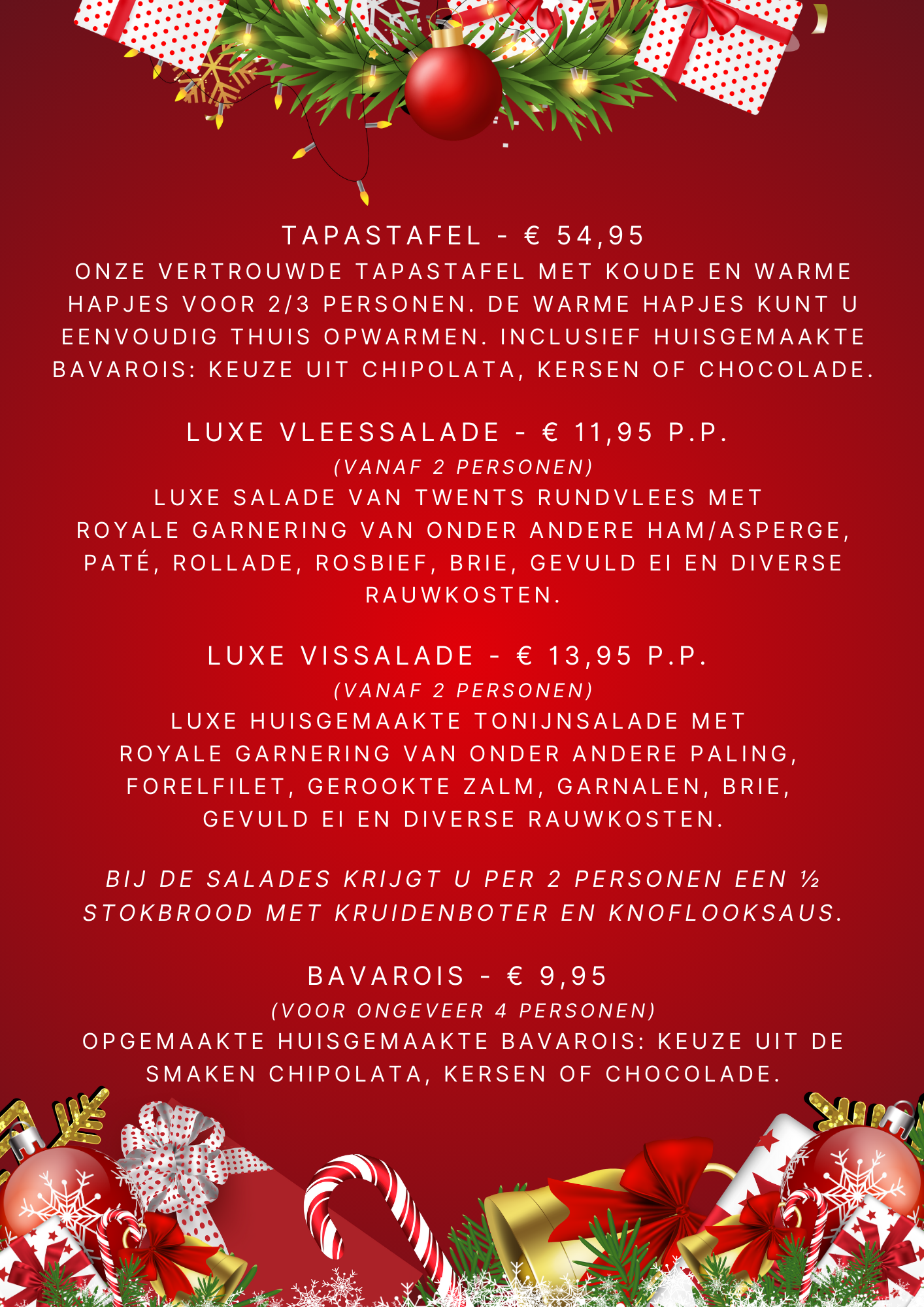 Daarnaast bieden wij u ook dit jaar weer de mogelijkheid om thuis te genieten van onze luxe salades, tapastafels en bavarois.
